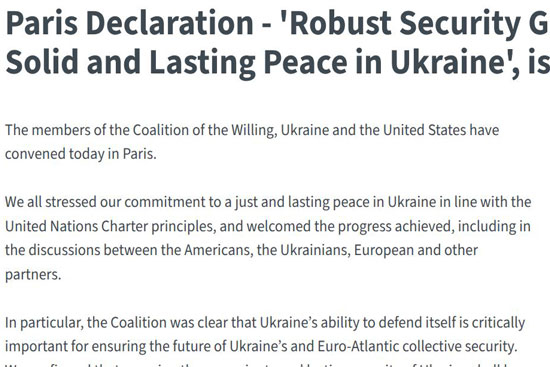 Sastanak koalicije voljnih, Ukrajine i SAD-a održan u Parizu 06.01.2026. je završio zajedničkom deklaracijom o Ukrajini. Ta Pariška deklaracija o Ukrajini koju Europska unija nije prevela na hrvatski mi sada donosimo u cjelosti.