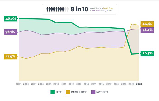 Po mišljenju Freedom House-a među državama s najveći padom demokracije u posljednjih 10 godina pored ostalih nalazimo Tursku, Mađarsku, Srbiju, Azerbejdžan, Poljsku, Indiju i SAD.